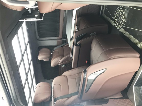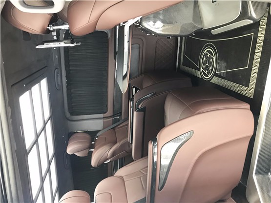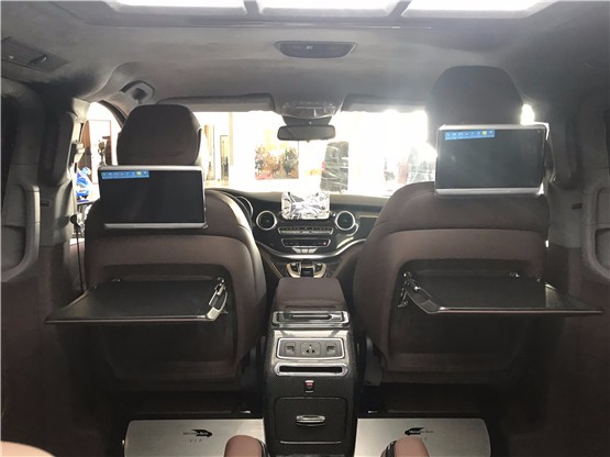 内饰配置: 真皮多功能方向盘 中控13.4寸彩色液晶集中控制显示屏(GPS导航,倒车影像,收音机,USB播放,上网功能,手机互联) vclass原装扶手箱,折叠式冰箱盖11L,后部储物盒,usb接口,220v电源接口 豪华一体式中央扶手箱(内置11L冰箱) 全车座椅意大利顶级Nappa真皮 MERCEDES-BENZ不锈钢踏板套件 12V电源借口 可拆卸式版桌板