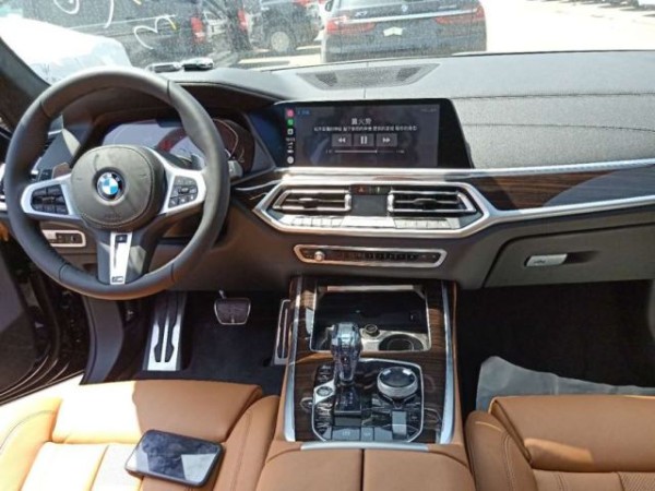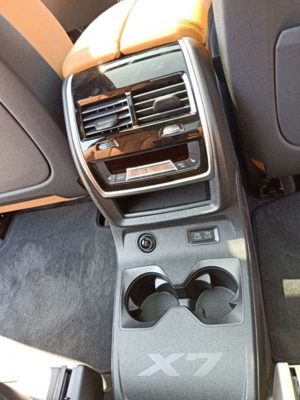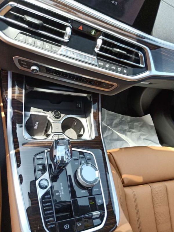 19款宝马X7内饰部分,宝马X7采用最新家族式设计语言,使用大量真皮、木纹饰板进行包裹。配备12.3英寸带有注意力检测的全液晶仪表和12.3英寸悬浮式触控显示屏。空调出风口与温度显示屏、实体功能按键结合在同一区域,并使用银色装饰条进行点缀。下方盖板下方为带有加热、制冷功能的杯架,全新的水晶电子挡杆造型十分精致,进一步提升了车内的豪华氛围。