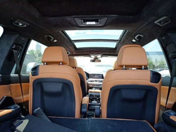 19款宝马X7车身侧面上方配有黑色行李架,前翼子板下方为长条状空气导流槽,腰线较为低矮且呈上扬之势,选用21英寸双五辐式拼色轮毂。车尾造型方正,LED尾灯组与粗壮的银色饰条贯穿相连,采用上下分段式电动尾门,排气采用双边共四出式布局,保险杠下方两侧配有大尺寸镀铬尾喉装饰。