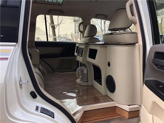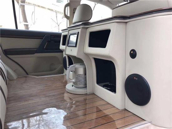 打开后排车门,哇,居然有隔断吧台。瞬间提升了档次,与众不同个性化从此开始。两边不但安装了大音响,而且吧台桌面也是实木打造。