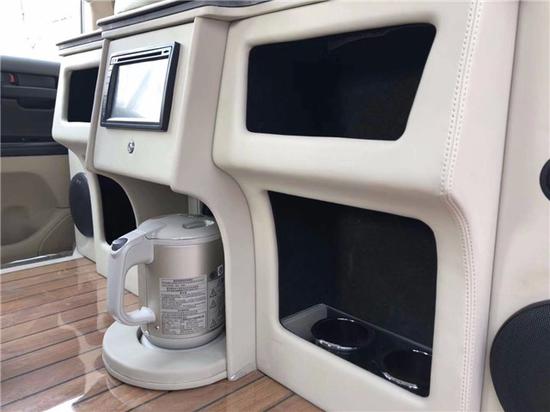 吧台正中间是智能显示屏,左右两侧是四个收纳格。下方还体贴的设计了热水壶,在路途中方便泡茶,饮水。