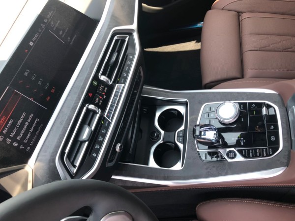 19款宝马X7这款车继续保持了宝马家族的奢华的作风,中控台遵循着宝马“以驾驶员为中心”的原则,首先在面板中央的位置,液晶中控台屏幕并没有悬浮在上面,而是与左侧的炮筒式仪表盘一起,内联在面板内。我们知道,中控台的屏幕一般是以长方形造型居多,但这款宝马X7的中控台就显得与众不同了,它是一种棱形的造型,设计十分前卫和潮流。下部的空调出风口也做了精心的设计,用一个六边形的很粗的银色镀铬条将出风口勾勒出来,与此同时,两个出风口并没有紧密靠在一起,而是中部留有很宽的缝隙,在远处望去,就好像是猫头鹰的两只眼睛那样,炯炯有神,非常生动。值得一提的是,挡把采用了水晶材质,视觉感受很赞