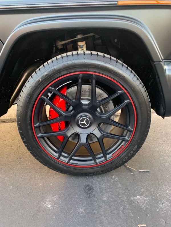 19款奔驰G63瀑式进气格栅可以说是家族最新的设计风格,也是在新车外观造型上与奔驰系列产品差异化最明显的地方。其中AMG系列的直瀑式格栅在新时代下的鼻祖可以说是AMG GT车型,它内部由12根竖置镀铬饰条组成,同时新车的保险杠进气口相比G 500造型也更具有攻击性。此外,新AMG G 63最大的轮圈尺寸提供22英寸可选,进一步提升了它外观造型的彪悍程度。展车不仅采用了全新的车身涂装,还搭配了红色的轮圈装饰,更加个性。