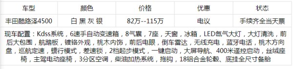 平行进口车在海外预定的全新2019款中东版丰田兰德酷路泽4500现车到店,配置丰富,颜色多选。本公司为了回馈老客户,对这款车做了一个优惠促销的活动,现车配置优惠万元,手续随车当天提走。现车配置颜色齐全,随时可提,全国。得益于国家的政策扶持,越来越多的汽车消费者开始了解平行进口车这一新生事物。相对普通中规车,平行进口酷路泽的性价比非常高。在外观细节内饰舒适性以及动力表现方面,到底如何?今天我们就来实车讲解下。对这款车感兴趣的朋友往下看,拨打下方咨询电话了解最新行情价格。
