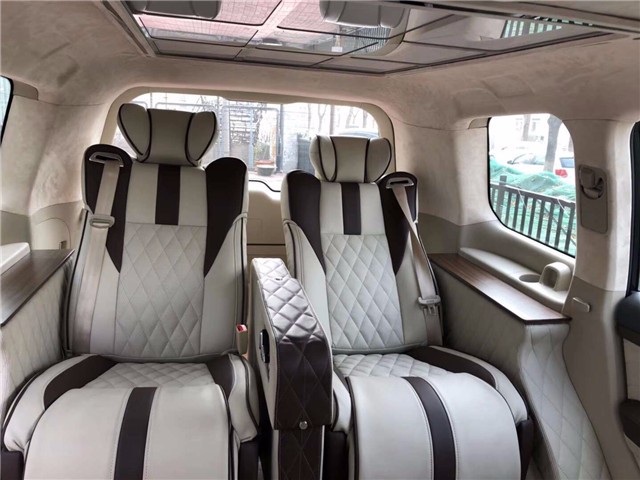 后排高配的航空座椅让您体验头等舱的舒适环境同样也采用了双拼的皮料。乞丐版原厂是没有天窗的,这辆车顶棚设计了九宫格的全景天窗,而且具有12种颜色的氛围灯调结。还有就是整车AB柱及把手全部采用鹿皮包裹。真的是豪华到你想象不到。