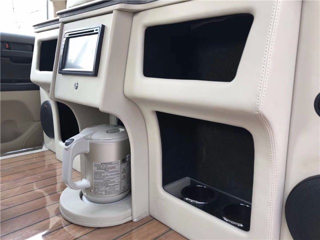 打开后排车门,哇,居然有隔断吧台。瞬间提升了档次,与众不同个性化从此开始。两边不但安装了大音响,而且吧台桌面也是实木打造。