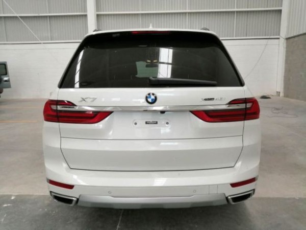 2019款宝马X7车身侧面上方配有黑色行李架,前翼子板下方为长条状空气导流槽,腰线较为低矮且呈上扬之势,选用21英寸双五辐式拼色轮毂。车尾造型方正,LED尾灯组与粗壮的银色饰条贯穿相连,采用上下分段式电动尾门,排气采用双边共四出式布局,保险杠下方两侧配有大尺寸镀铬尾喉装饰。