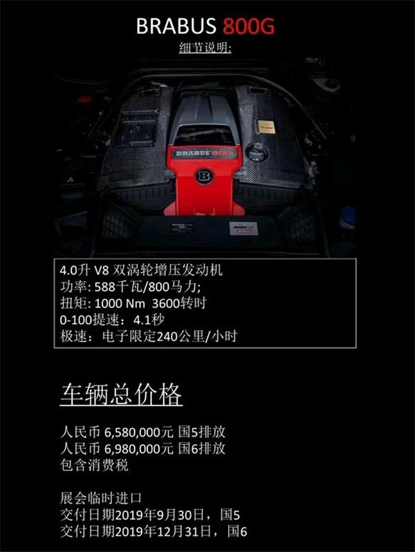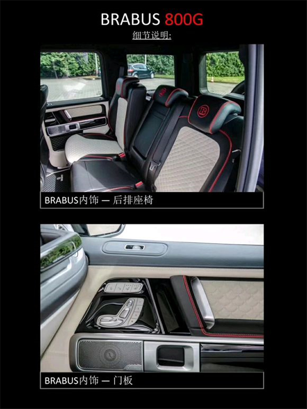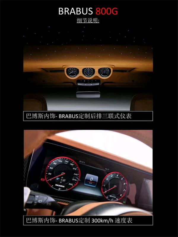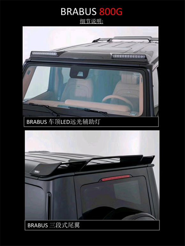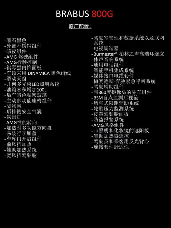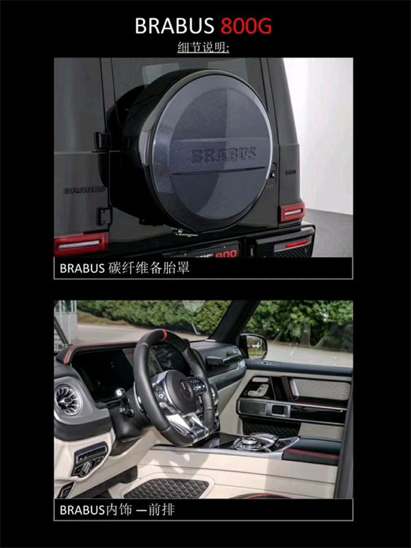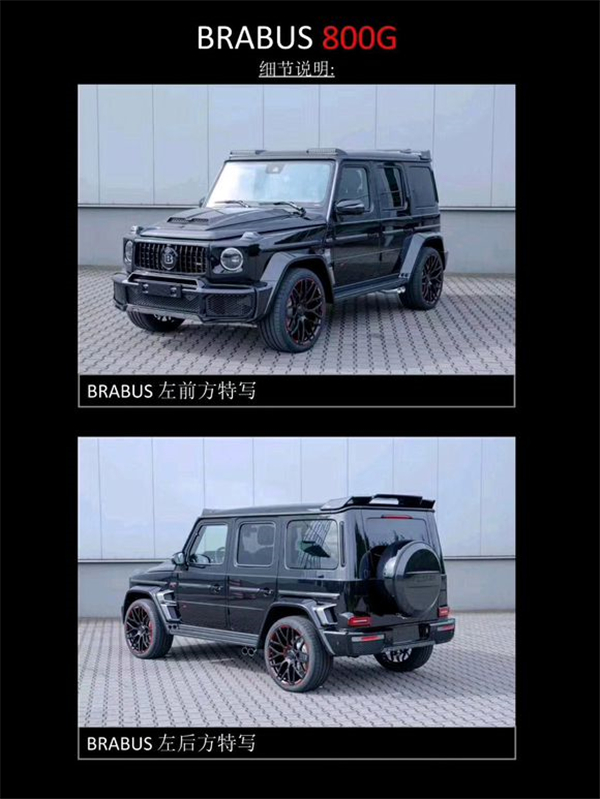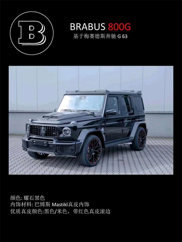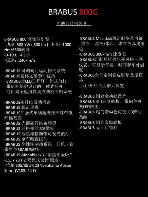BRABUS 800G :配备全新BRABUS 800 V8发动机,最大功率588千瓦/800马力,最大扭矩1000牛米,0-100提速时间4.1秒,极速限定240km/h。