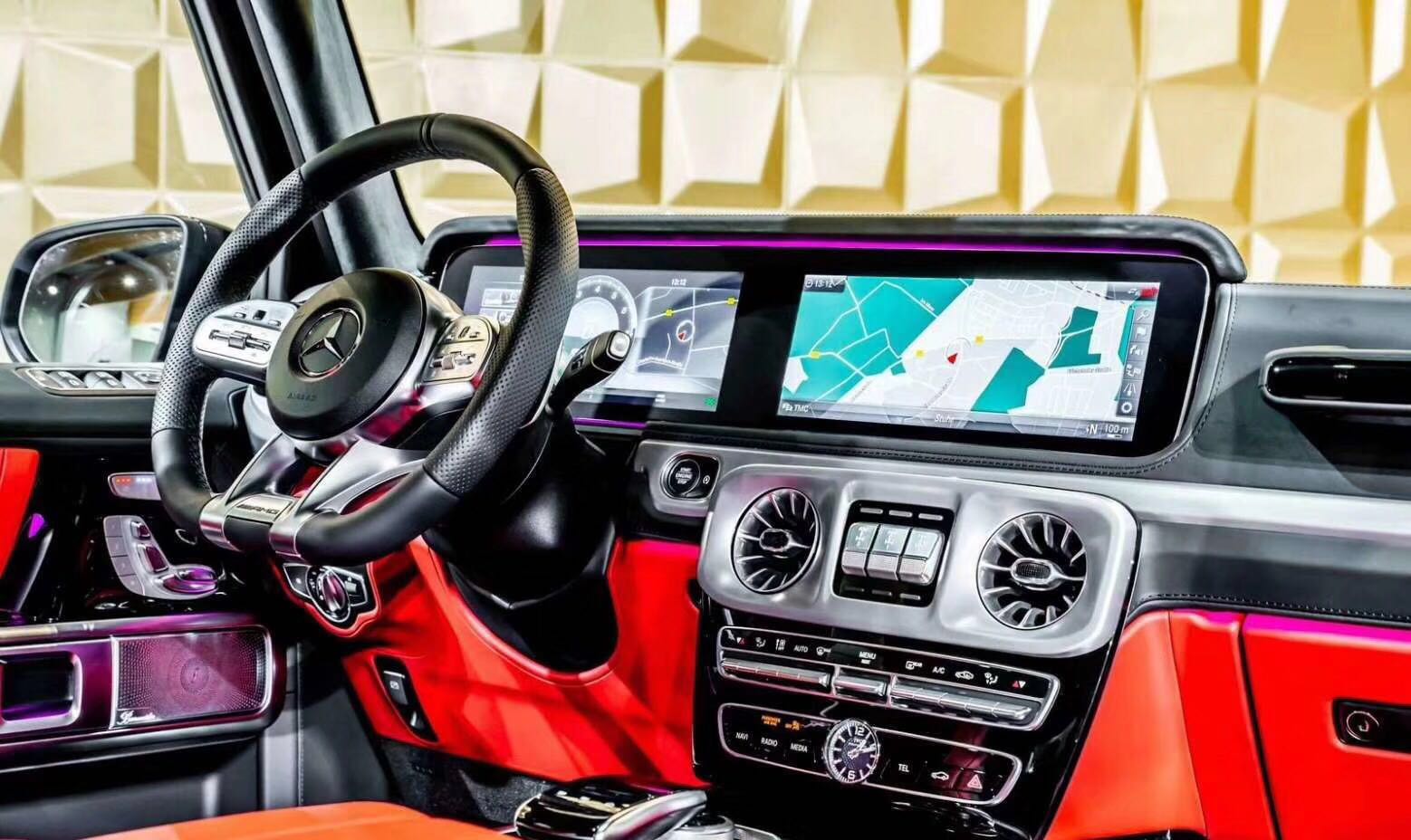 相对于老款的奔驰G来说,档次、质感和科技配置都明显提升全新奔驰G级的内饰相比老款有了明显的提升,采用了奔驰最新的双屏幕式设计,全液晶仪表盘和中控台屏幕都达到12.3英寸。同时内饰质感和工艺都有了很大的进步。较之于现款车型,它的内饰发生了巨大的变化,融入了不少现款奔驰S级、E级的设计元素,从而变得更加豪华,而家族式的连屏设计则凸显了车内的科技感。当然了,经典的“三把锁”按键自然不会缺失,并且设置在中控台最为显眼的位置。