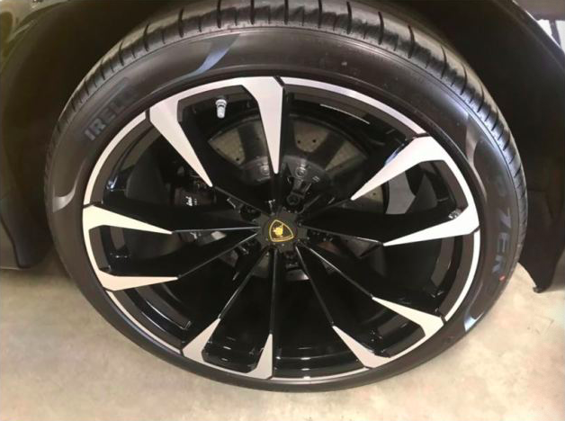 车轮是兰博基尼标准动作的前窄后宽配置,目前 国内测试版本是入门级的21寸规格,另外还有更大的22寸规格和23寸规格可供选择。22寸轮毂采用五幅双叉的雪花风格式样,分别搭配了 285/40R22的前轮和325/35R22的后轮,23寸轮毂则是双五幅式样,分别搭配285/35R23前轮和325/30R23后轮。