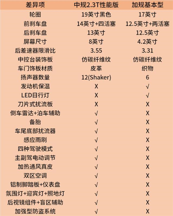 音响方面,中规是12扬声器Shaker音响,加规基本型则只有6扬声器普通音响。车内灯光,两者也有差别,中规有氛围灯、迎宾踏板灯,以及野马logo地面投射灯,这三项加规基本型也没有。此外,中规性能版还比加规基本型多了铝质油门踏板以及增强型防盗组件,两者的具体配置差异,可看下表: