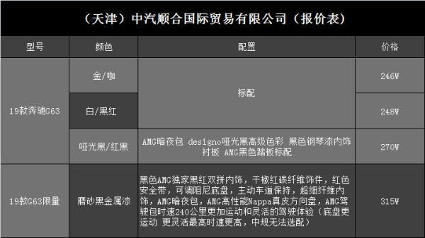 19款奔驰G63选装配置:轮圈尺寸(21,22时AMG轮圈),座椅样式(Designo NAppa真皮, AMG NAppa真皮),方向盘材质(Nappa真皮,Dinamica微纤维,Nappa真皮),几何多光束大灯,64色车内氛围灯,64色车内氛围灯,后排侧气囊,倒车影像+全景摄像头,自适应巡航+盲点辅助,主动泊车辅助,12.3时液晶仪表,柏林之声音响,前风挡加热,电动天窗+隐私玻璃,方向盘加热,主动多轮廓前按摩座椅,前座快速通风加热。