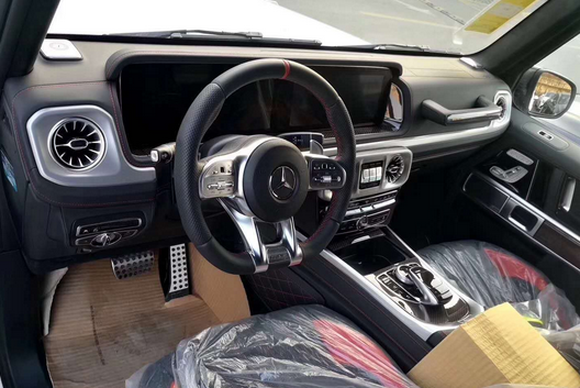 2019款全新G63内饰方面,新G63保留了新G500的整体设计,除配色差异外,新车还换装了全新造型的平底式AMG运动方向盘,其两侧配以打孔皮质包裹,下部镀铬装饰的造型也与新G 500明显不同,看上去十分战斗。此外,全液晶仪表盘+控中大屏的双12.3英寸屏幕设计在新车上也没有缺席,营造出了浓郁的科技感。
