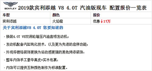 宾利在打破了以往豪车的墨守成规后,再次突破价格的疆界。这个自带光环的品,连续赢得1927、1928、1929及1930年勒芒赛事冠军,每款车方向盘中间的“B”给人跃跃欲试之感。2019款宾利添越V8 4.0T汽油版现车价格占据优势,有意向的朋友可咨询文章底部电话。