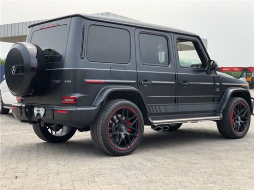 19款奔驰G63 Edition one 磨砂黑/黑红 配置:9速AMG变速箱 黑金属漆 ,黑色AMG独家黑红双拼内饰,干椒红碳纤维饰件,红色安全带,可调阻尼底盘,主动车道保持,主动刹车辅助,AMG红色卡钳 ,雷达测距,柏林之声3D音响,电动天窗,风挡玻璃加热,超细纤维内饰(鹿皮顶),64色氛围灯,360环影,停车辅助(中规智选套装,选装加 24200),几何多光束LED大灯(中规G63选装加19000元),AMG暗夜包,增强座椅舒适包(多轮廓座椅,通风按摩),AMG高性能Nappa 真皮方向盘,AMG驾驶包时速240公里更加运动和灵活的驾驶体验(底盘更运动 更灵活最高时速更高,中规无法选配)