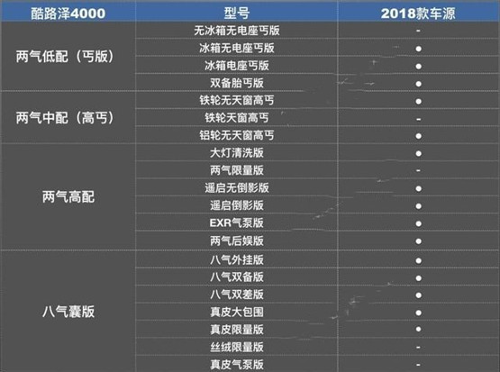 酷路泽4600丐版,也叫“丐酷”,其实就是两气囊型号里的低配版本。丐版官方名称叫GX,有四大特征:黑中网、卤素灯、铁轮圈、两排座。但中网、大灯、轮圈都是很容易改装的。唯独两排座,很难改装成三排。所以,丐版和高丐的区分关键,就在座位数。但凡没有第三排的,都是丐版。丐版酷路泽,一共分4种配置,以冰箱和电动座椅来划分。最低配的既没有冰箱,也没有电动座椅,所以叫“无冰箱无电座丐版”。次低配则增加了冰箱,所以叫“冰箱无电座丐版”。在次低配基础上又增加了电动座椅的,就是我们这款“冰箱电座丐版”。它有哪些关键配置呢 我们来看一看。首先,是黑中网和卤素大灯,这是丐版的标准长相。另外,由于是2018款,所以它多了流水灯,但还是没有雾灯。丐版都只有17寸铁轮,没有铝轮。但是,都有胎压监测,后视镜转向灯,外加舒适进入,也就是智能卡,这三项都是全系标配的。此外,冰箱电座丐版,还独有祥云彩条。车尾,丐版也标配拖钩,但尾门上都没有型号字母标。只有中高配GXR才有。车内,除了冰箱之外,它还有电动主驾,这是它最拿得出手的配置了,但副驾依然是手动的。酷路泽4000只有顶配真皮型号,才会拥有电动副驾。变速箱,从5AT升级成了6AT,并且,丐版也全都标配了蠕行系统,一键启动,以及ESP车身稳定,只是依旧没有大屏。不过,2018款的冰箱电座丐版,最近出现了另一种配置:不带彩条和流水灯,但多了大屏和踏板。不过车源很少。冰箱电座丐版,并不是“丐酷”的最高配。在它之上,还有一个双备胎丐版,多了备胎、踏板和大屏,但没有流水灯,目前没有车。