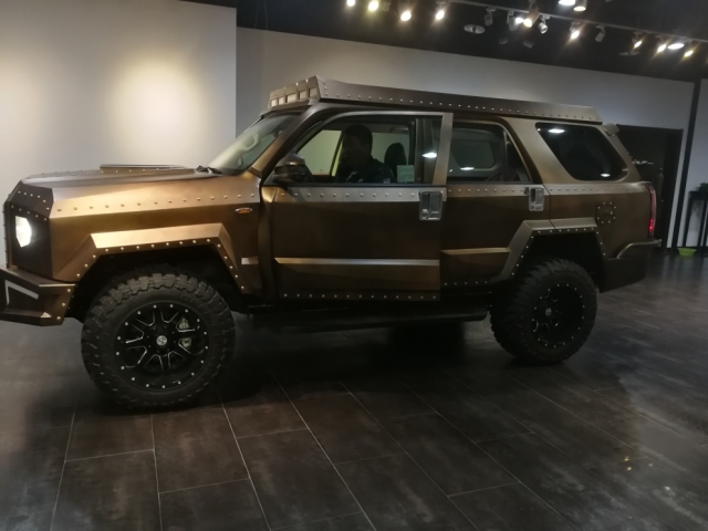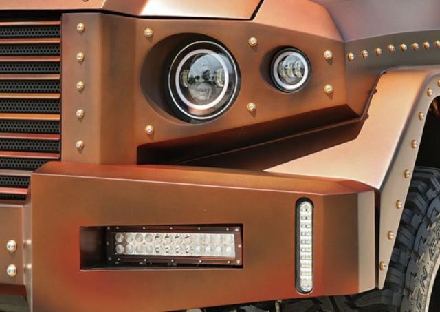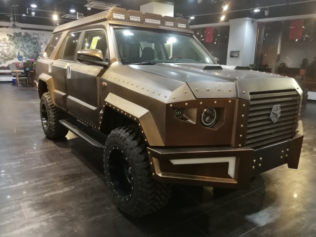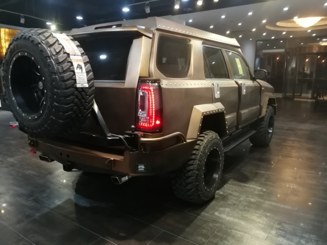 车型总结:乔治巴顿越野车在外观造型上刻意突出了威猛的形象,车身覆盖件设计得粗犷而充满张力,突出的前灯、尾灯、车门把手、牵引钩以及大面积的镀铬装饰条更强化了这种感觉。驾驶舱内有夜视系统、卫星导航、防生化毒气系统、供氧设备等安全设备,还有多媒体影音视讯系统、高科技卫星侦测系统。