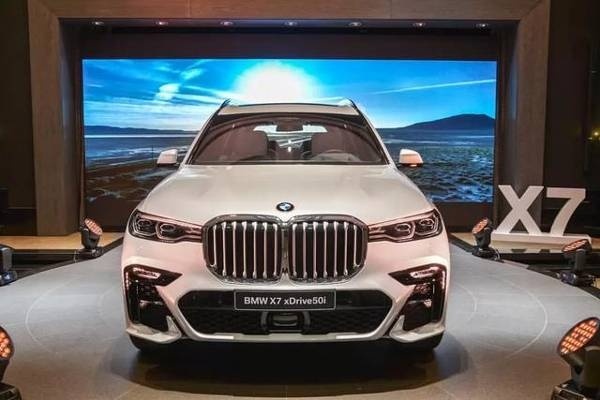 宝马X7是与宝马7系同平台打造的一款SUV车型,下图是外媒拍摄到的宝马X7的实车图,可以看出新车的前脸设计还是采用了宝马的经典设计风格,但是前脸设 计更加夸张霸气,巨大的双肾型进气格栅比之前宝马车型的进气格栅更加宽大,矩阵式的前大灯设计与进气格栅连接到一块,使整个前脸看起来更加宽大,前脸下方取消了雾灯设计,改为了五边形的导流装置,下面一条镀铬饰条贯穿而过,为整个前脸增加了层次感。