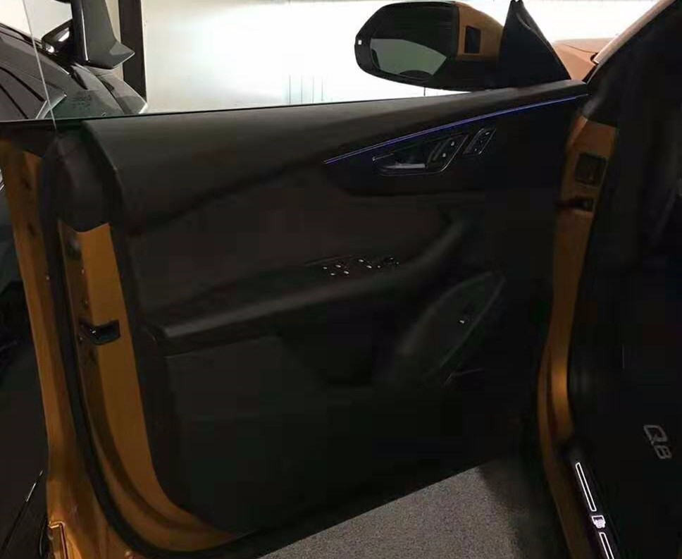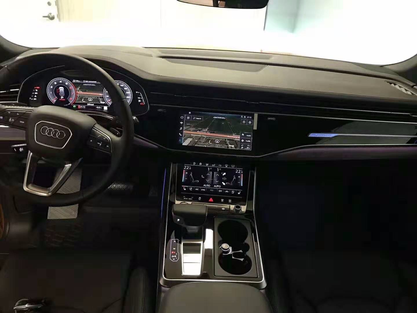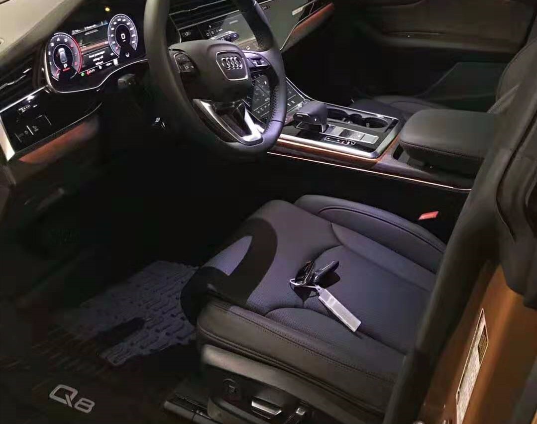 19款Q8特别要说的就是,配置三荧幕显示,皆为LED;外置摄像头,支持360°环景显示,3D触控显示,排挡杆与q7相同。车内整体为软材质包裹。科技感十足。