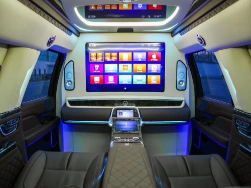 19款林肯领袖一号的内饰是纯手工打造,内饰布局上前后舱隔开设计,隔断上配置升降电视,座椅则是对坐设计,再通过各种巧妙的设计,让各种电子设备融入车内。