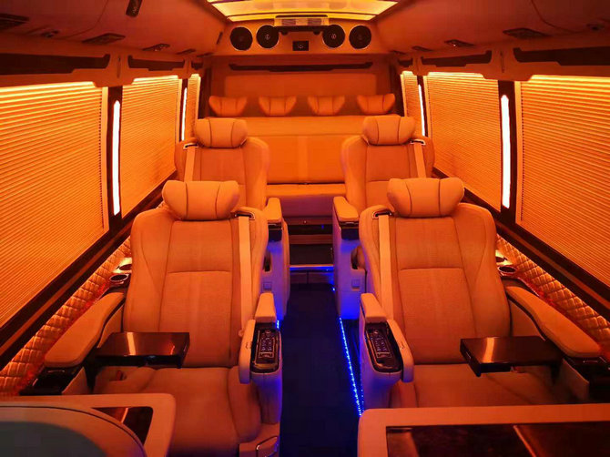 改装后的丰田考斯特列如12座至尊奢华版,采用进口埃尔法高端座椅通风加热、多角度调理、按摩等功能车载冰箱、车载文娱系统(卡啦ok、车载液晶卫星电视、可接受200个左右电视频道、多功能操控台、车内一切灯火的操控、驾驶室与乘坐区的电动距离开关、空气净化器的开关等等、桃木办公桌、电动折叠百叶窗帘、后排电动沙发床等等。