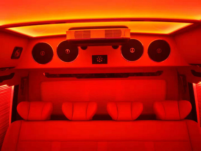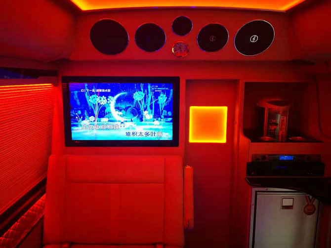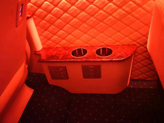 我们在乘客舱里的改装项目更多,从距离处的衣柜我们能够看出悉数车内寻求的是奢华酣畅,是一个很私密很现代的改装,上车后翻开我们的暖气会很热,在车上进行文娱活动时能够将衣服挂在衣柜里,很便当的。在外出查询时时间长时能够带不一样场合的衣服放在衣柜里,非常的商务快捷。如果是长途出行,还能够备一床被子,夜晚在后排沙发床上休憩。