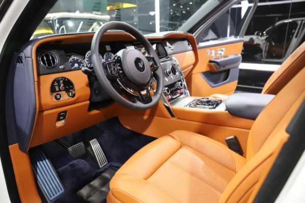 车型配置:车身选装套件:英吉利白首发包:环绕座椅加热, Cullinan亮,车架号铭,座椅头枕劳斯莱斯标,带颜色座椅嵌边,带颜色缝合线,后桌板,表盘,羊皮脚垫,侧门发亮cullinan标,劳斯莱斯订做音响,驾驶辅助包,后娱乐。标准配置:远程服务22寸部分抛光轮毂灰色轮毂盖真皮内饰:阿马尼亚克棕/海军蓝RR头枕刺绣海军蓝座椅滚边内饰面板:开孔黑木内饰选装件:前后排通风座椅前排按摩座椅特殊定制内部氛围设计劳斯莱斯定制音响,全景天窗车顶皮革延长外部电动关门羔羊毛脚垫后排影院系统餐桌板后排两侧窗帘后排隔屏窗帘四座座椅