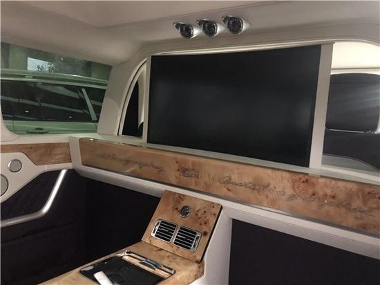 内饰方面:多功能方向盘、液晶仪表盘、触摸式显示屏均为车内标配,座椅也可以调整角度,前方路况一览无遗。由于皇家一号车身较长,所以配备了前后对讲功能。真皮座椅出自英国上等的品牌,座椅有细线捆边,手工一流。贵宾区双行政座椅多向电动调节,带按摩、加热、通风等功能,车顶以及车门装饰版全部为欧洲顶级小牛皮包裹,纯手工精心制作而成的高级地毯,后排配备有鞋托,特殊定制的LED氛围灯、及按钮控制系统,让您置身车内尽可享受舒适奢华的贵宾式待遇!