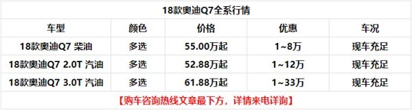 此次上市的2018款奥迪Q7主要对配置进行了一定升级,相比现款车型,新车全系标配LED大灯(顶配车型配备矩阵式LED大灯)、座椅加热、12.3寸全液晶仪表及智能接口等配置,一定程度上提升了奥迪Q7车型的竞争力。此外,新车还新增了瓦吉特金的外观颜色及雪松棕内饰颜色供消费者选择。