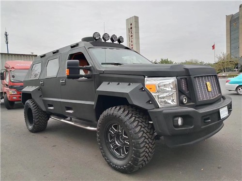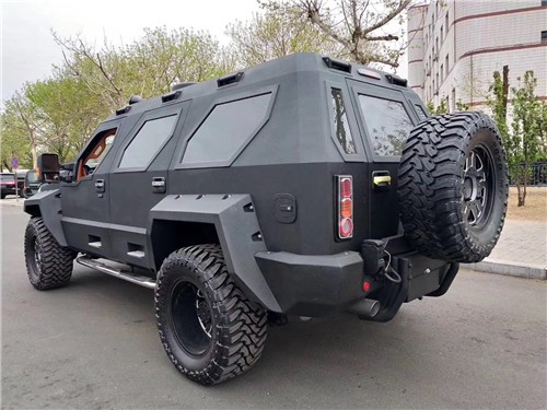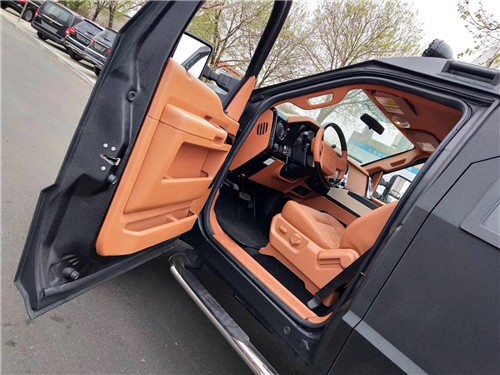 乔治`巴顿夸张的车身尺寸,厚重的装甲加上亚光黑色车漆,凶悍霸气的气势绝非一般车型可以比拟,车身侧面延续了粗犷的设计风格,打开后门进入后厢,这才是这辆车最重要的部分,低透光度的暗色玻璃在车外几乎看不到车内,你不配置也可谓是极尽奢华,第二排独立的两个座椅舒适宽敞,完备的影音系统提供了非凡的视听感受。
