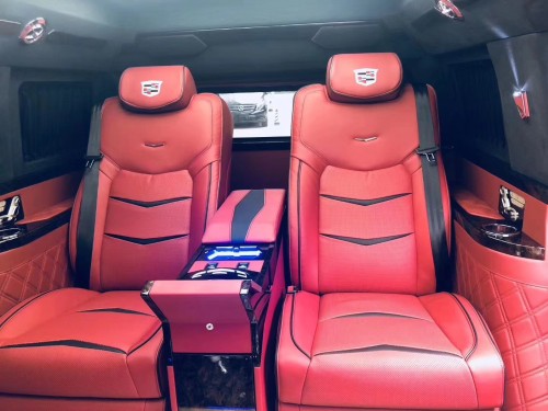 凯迪拉克总统一号整个后舱为四座规划,两个主座为至尊奢华真皮头等舱座椅款式,且带腿部支撑和电动按摩加热功用,四座椅头枕处均印有凯迪拉克标识。主座椅中央扶手处还设有控制台,让您置身舒适的座椅不必动身就可操控车内设备,相当人性化。