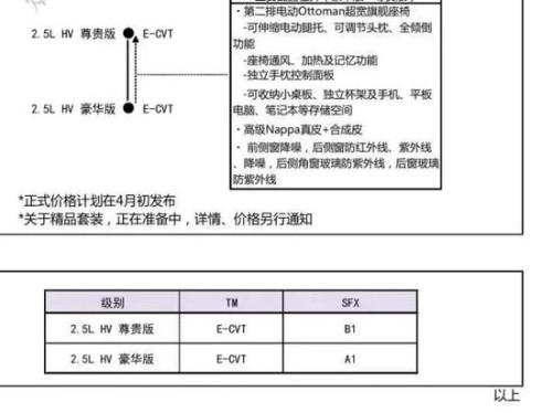 该车共分为两款车型,分别为2.5L HV尊贵版和2.5L HV豪华版。车身颜色有晶钻黑色、流光银金属色、至臻黑色、石墨灰金属色、珍珠白色,共计五款。内饰有亚麻色(仅限尊贵版)、黑色,共计两款。