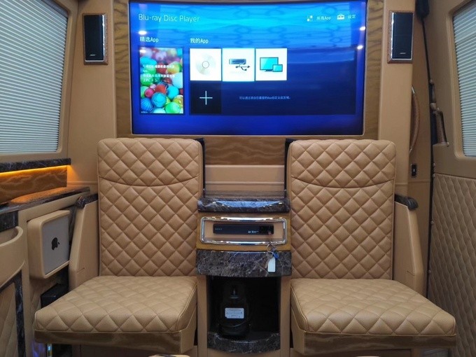 奔驰斯宾特:整车尺寸5910*1993*2800mm,车内空间宽阔,色调明亮(米白色),座椅呈2-2-3型排列,整洁美观,真皮制作,柔软舒适,驾驶舱与乘客舱全隔断分开,但雾化玻璃解决了互通的问题,乘客舱独立座椅具备电动加热、按摩、通风等功能,可多方位调节,后排沙发座椅可以平躺成床,中排与前排之间可以添加桌板,成为移动办公室。车舱顶部配置LED灯光七彩变化,遥控控制定格颜色,可以是功成后的祝贺模式或放松心情的治愈模式。