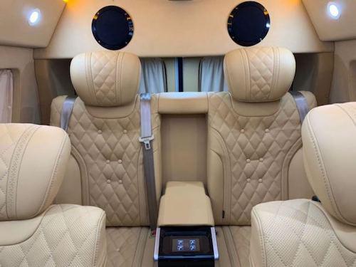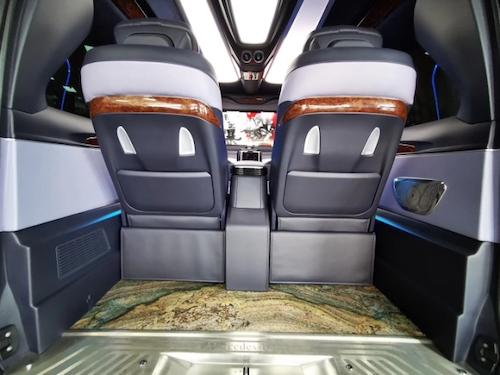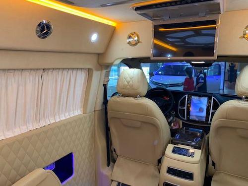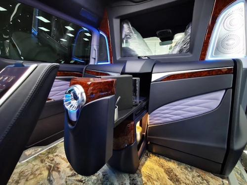 这款经过改装过后的奔驰Metris,内饰更是奢华到了极致,共配置了:中央竖屏式大屏导航,顶配流线型中央扶手带冰箱,仪表台包覆,内门式包覆,全新升级第四代座椅,第二排通风加热按摩可旋转座椅,第三排电动可放平座椅,双侧电动门,可拆卸式会议桌,豪华柚木地板,双高清定制头枕电视,前排电动座椅调节,门饰条高光泽胡桃木,进口行云流水麂皮绒包覆,贵宾区强化隔音隔热处理,触控屏调光控制系统等等。
