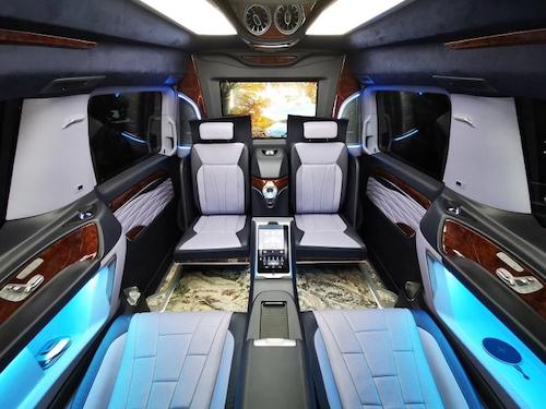 进口奔驰维特斯在有限的空间中见可能明显地展现出内饰装饰品位格局地与众不同。全车玻璃隔音隔热处理,麂皮绒顶皮革包覆,嵌入大量迈巴赫宫格顶灯以及覆盖四季环保透明薄膜的柚木地板等诸多改装新元素。