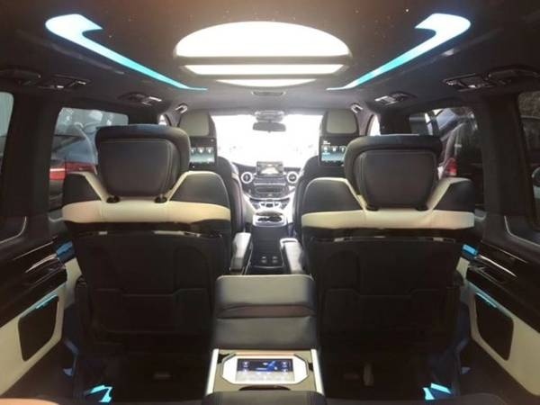 进口奔驰V (配置|询价)250,车长5.37米,高1.89米环保清单♻️!!!19寸铝合金锻造巴博斯版轮毂,4电动座椅,双向电动门,电动折叠后视镜,倒车影像,车顶行李架,电动尾门,前后雷达,涡轮空调出风口带香氛,雨量感应雨刷,内饰氛围灯,脉冲式LED尾灯,全车纯碳纤维巴博斯版限量款外观空气动力学套件,双边双出排气,LED日行灯,全车巴博斯版限量款碳纤维内饰套件及镀铬套件,定速巡航,雨量感应雨刷,第三排车窗电动开启,全车内饰蓝白双色Napa真皮搭配高档皮革,全车TORAY高级合成鹿皮顶棚,中央扶手箱及原厂中排后座小桌板,11.6寸1080PX1920高清大屏后座娱乐,支持Wi-Fi上网及高清视频在线观看,后座5寸智能控制触摸屏,控制后排3人乘客座椅,后座娱乐系统支持WI-FI上网及热点共享,支持无线蓝牙耳机,舒适多向电动调节总统级商务座椅,带加热、通风、按摩,后排乘客座椅可放平180度做为家庭出行商旅舒适休息床铺,带加热、通风,进口实木印花蓝宝石水晶地板。