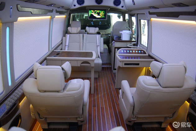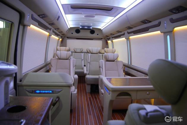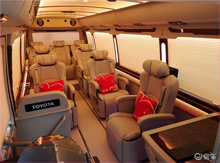 [丰田考斯特海狮4S旗舰店---原创]丰田考斯特增加了隐私玻璃以及外观镀铬装饰和镀金标识,庄重感与豪华感油然而生。车内还配备了吸顶式电视,让您可以在车内打发闲暇的时间。舒适的航空座椅,使考斯特象家庭轿车一样舒适。,由外是稳重嗲压的车形及色彩,由内是宽敞明亮的乘客舱,豪华的座椅设置,先进的影音配置及专用的VIP车悬架系统,乘坐至于,舒适尽享,行走之间,更有一番尊贵风范。
