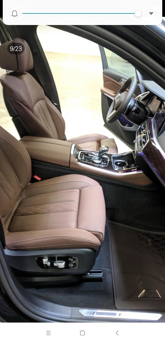 车内部分:第一个:是全液晶仪表,样式发生了变化,表圈的形状很不规则,显得有点凌乱,很多人都说还不如圆形顺眼。第二个:是座椅调节跟屏幕联动,当你手触碰到座椅调节按钮的时候,中控屏幕上就会出现示意图,显示你正在调节的座椅区域。第三个:是全系标配了无线充电,就在中控台杯架的前面。第四个:是全系标配了手势控制,我来试一下调节音量,转动手指就可以,其实挺难一步就调节到你想要的音量,它主要是方便开车的时候操作,这样眼睛就不用离开路面。第五个:就是新版的空气悬架,拥有5档高度调节,最大调节范围是正负40毫米。不过,最低的那一档是用来装载货物的,其余4档才是用于行驶。并且,X5的空气悬架跟后轮转向系统,是互不兼容的,所以,要么选有助于越野的空气悬架,要么选有助于公路驾驶的四轮转向,两者不能兼得。
