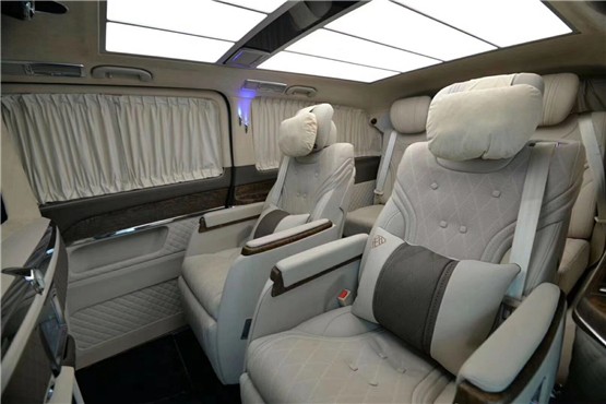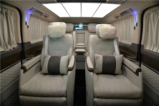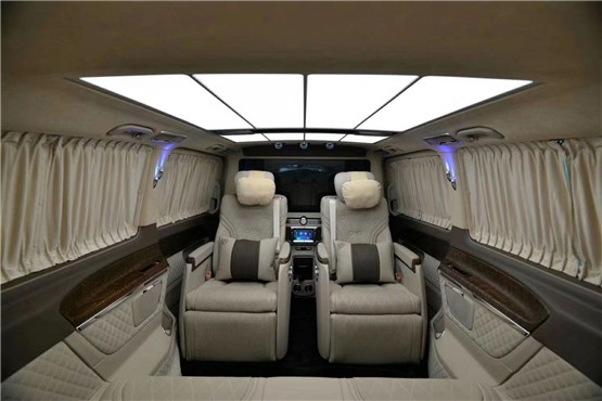 奔驰V250改装迈巴赫VS680订制版后排座椅柔软舒适、支撑足,坐姿可调幅度非常大,能够让乘客半躺姿势乘坐在后排,腿托加分,对比同级别车型,这个后排必须满分。科技感十足,并且加入前、后排手机无线充电功能及头等舱级后排独立座椅。后排座椅支持180度电动放平,出行老人孩子可以在上面小憩一会!