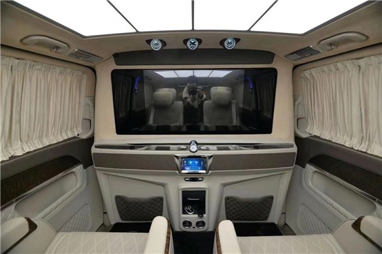 2019款奔驰V250房车贵宾舱则用采用豪华皮革、麂皮绒包覆,前后舱采用电视+吧台的实用隔断,BOSE5.1殿堂级音响环绕系统+42寸高清升降电视+索尼蓝光DVD的经典车娱组合,给您舒适与娱乐相结合的享受。