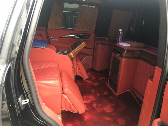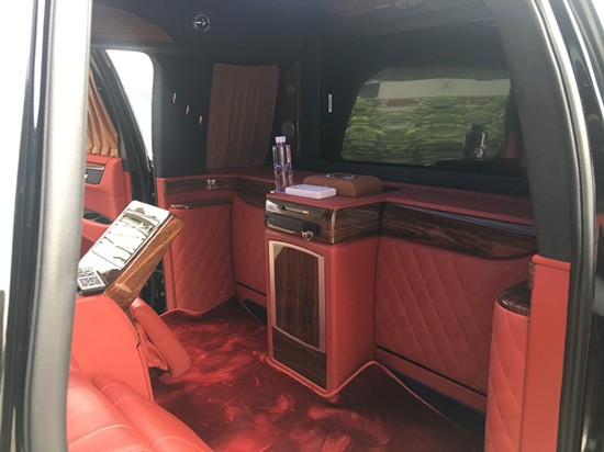 18款总统一号商务车内饰的设计绝对是奢华至知,奢华敢为,整体的主题效果贯穿其中,仪表盘、触摸屏、多功能方向盘以及三种不同风格的木饰搭配,绝对是吸睛手笔,内部配备了真皮桃木内饰,高级地毯,高级豪华的异域吧台,带来梦一般的境界,用料考究,凯迪拉克加长总统一号顶级真皮面料搭配实木材质,出自名家手工的工艺工序,艺术品的称号当之无愧。