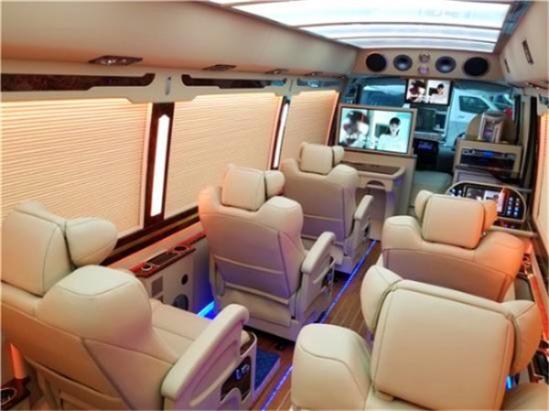 窗帘内侧可以加装LED蓝色灯光,车内立柱加装LED灯光,台阶上也可以镶嵌LED灯光,显示品牌坐标等。同时还可以在通道来两侧增加LED蓝色灯光。我们都知道,光是最能衬托氛围的选择,对车内灯光的改装可以带给我们独特的视觉感觉,营造出或温馨或者淡雅的乘车环境。