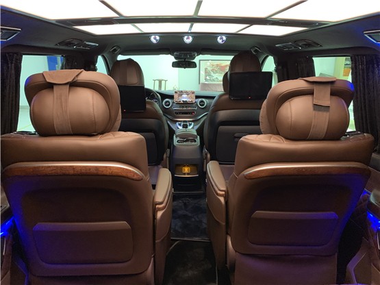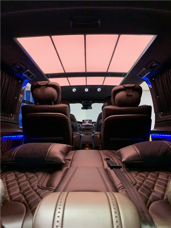 迈巴赫VS680商务车车顶采用八块LED的长方形顶灯设计,荧光灯下的亮度刚刚好,还有很人性化的弧形顶。奔驰VS680无隔断的设计,使得车内的空间视野最大化,不会有压抑感,也方便了车内的沟通交流。