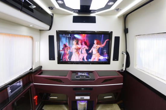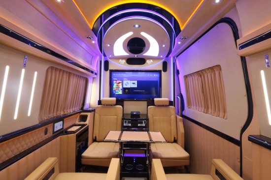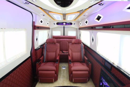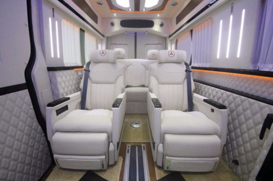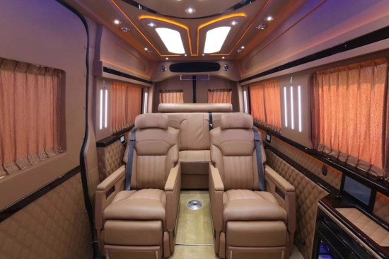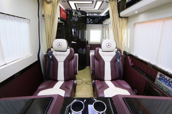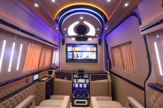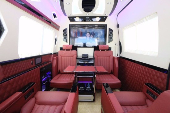 斯宾特Sprinter仪表盘及门饰板真皮包覆,前舱纯手工羊毛地毯及脚垫,全车NAPPA真皮航空座椅(带旋转),全车柚木地板及脚踏板,BOSE5.1家庭影院系统,星空式车顶,纯实木气撑小桌板,不锈钢挂衣杆真皮包覆,车载专用大容量冷藏箱,电动升降32寸液晶电视一台,电动遥控窗帘等,各种豪华配置集于一身