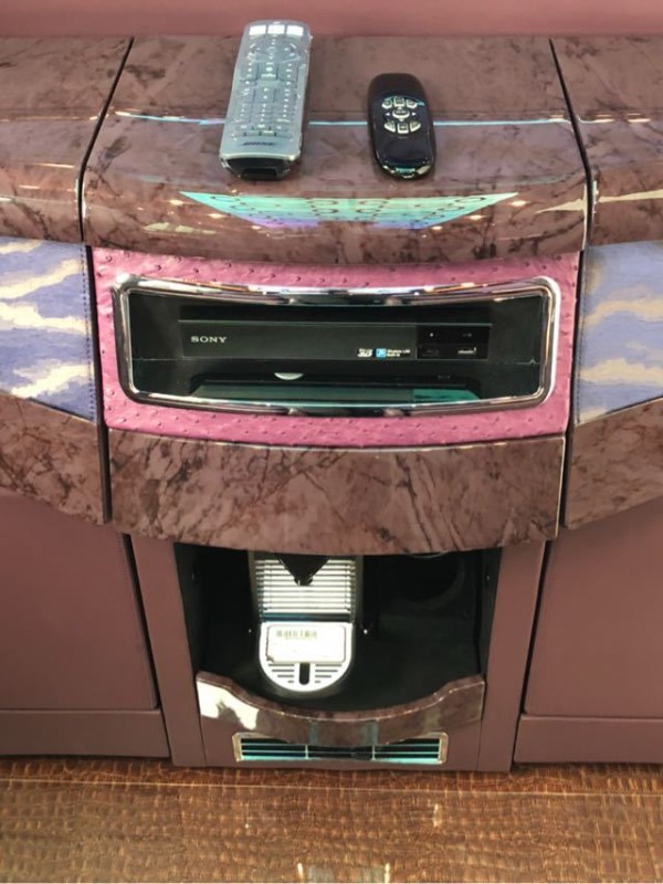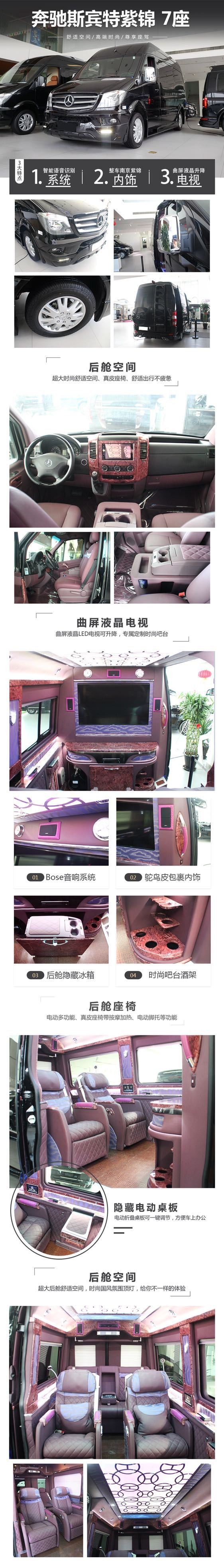 18款奔驰 斯宾特 紫锦版配置:发动机:3.5 V6 258马力 5速手自一体变速箱长*宽*高:5910*1993*2840 轴距:3880油箱容积:100L配置:紫锦1、提花木机织造工艺独特的南云锦2、珍贵鸵鸟皮手枕包裹及扶手包裹3、高端鳄鱼皮地板4、隐藏办公桌板5、进口空气净化器6、超大液晶曲屏电视(可升降)7、多功能触控屏8、德式航海钟9、5.1声道环绕立体音响10、头等舱航空座椅(带一键展开及通风、加热、按摩)11、前后无线对讲电话12、隐藏式220V电源插座13、双豪华隐藏座椅7+2布局14、多功能豪华吧台带一键展开15、手动百叶窗帘16、电动伸缩脚踏板17、进口胶囊咖啡机18、进口豪华车载冰箱19、超高清蓝光索尼DVD20、电动门带防夹功能21、时尚爬梯备胎22、前后雷达及高位倒车影像23、时尚运动包围24、LED日间行车灯25、卫星信号接收器26、语音控制系统27。换气侧窗。