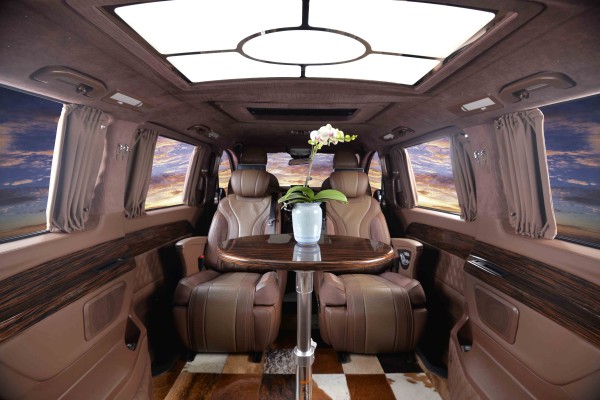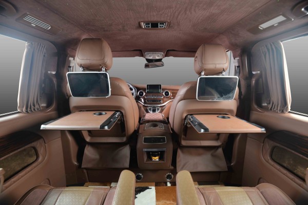 关于整车的布局,进口奔驰V250豪华房车在前后舱全隔屏设计的基础上,采用了常规模式下更加凸显后舱空间流畅性的4座样式,重点提升后排航空总裁座椅的乘坐性。通过座椅扶手间的触控屏,可实现后舱的光影氛围、中央隔屏电视、两侧电动窗帘以及座椅的角度伸展、按摩加热等多项舒适向体验。电动伸展的隐藏小桌板,充分顾全商务出行的便利性,两侧带隐私储物格以及用于放置手机的凹槽、杯托等配备,右侧车壁集成有高强度的随车密码箱,以应对商务行程的现金、文件存放。