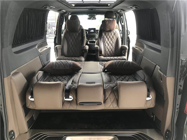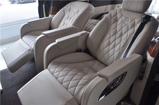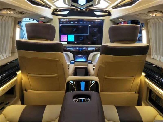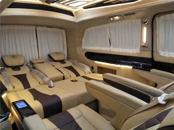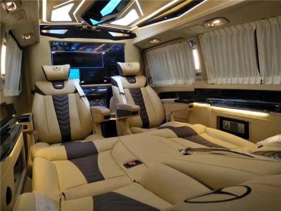 奔驰VS680采用隔断式吧台,42寸可升降液晶电视,吧台中间镶嵌一块万国表,全车真皮包裹。整台车采用了前后无隔断的设计,隐私性稍差空间性更好,便于商务接待的同时兼顾家用,定制风格采用经典的迈巴赫元素,宽大的航空椅配上迈巴赫舒适头枕,坐在上面就想美美睡上一觉。座椅带有8向的电动调节,超长的腿拖和按摩功能。无论出游还是商务会谈都十分凸显逼格儿!