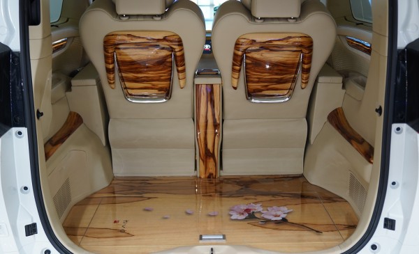 地台的设计采用了紫檀木的地板,典雅中又透露着尊贵,同时吧台也采用了貂绒的脚拖无处不透露着这款车的奢华。座椅采用了原装进口的一键式记忆电动折叠航空座椅,这一座椅配备有加热、通风以及气动按摩的功能,几乎你能想到的舒适性配置也都配备了。