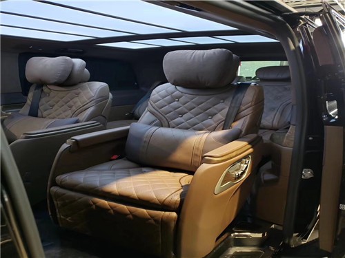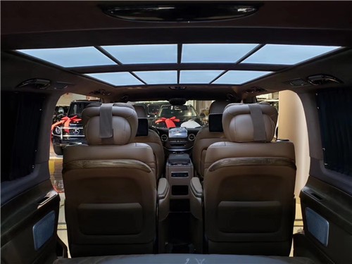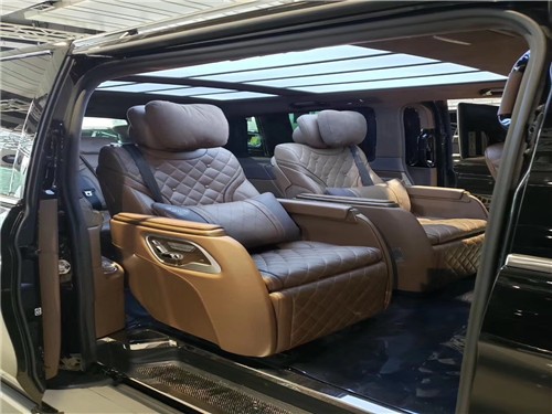 小窗侧拉窗、全车镀铬套件+车窗亮条、V-class (配置|询价)大灯和尾灯、日间行车灯、顶部行李架、实木高光装饰件+涡轮出风口、二排奔驰原厂化妆镜、中门右侧雨伞桶+迈巴赫雨伞、全车内饰镀铬装饰套件、四门奔驰原厂中控锁、全车内饰真皮包覆、九宫格顶灯、奔驰原厂分体休息脚踏、四门镜面迈巴赫迎宾踏板、咖啡真皮仪表台、台湾皮诺基手动窗帘、进口翻毛绒顶棚、进口纯羊毛地毯、行政会议桌、12.1英寸后排头枕娱乐屏、前排扶手箱加12L温控冰箱、前排电动座椅带通风加热、迈巴赫旋转电动航空座椅奔驰原厂开关、第三排180°电动沙发床奔驰原厂开关、后排折叠小桌板、倒车影像、水转印装饰件、新款迈巴赫19寸轮毂、迈巴赫大包围+竖条中网+侧裙、藏蓝色羊绒地毯。