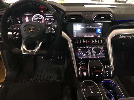 整体的内饰造型有点陌生,但所有的细节元素又如此熟悉,六边形结构遍布,从中控台到换挡区域都是不规则造型。Urus车内有3块屏幕,全液晶仪表盘之外,中控给了上下两块屏幕,和刚发布会的新一代A8一致。三幅平底的方向盘为全新样式,皮质和Alcantara材质组合给了它绝佳的视觉效果和手感,中控点火按键上的“红盖头”则延续了兰博基尼传统,让你有一种启动的仪式感。